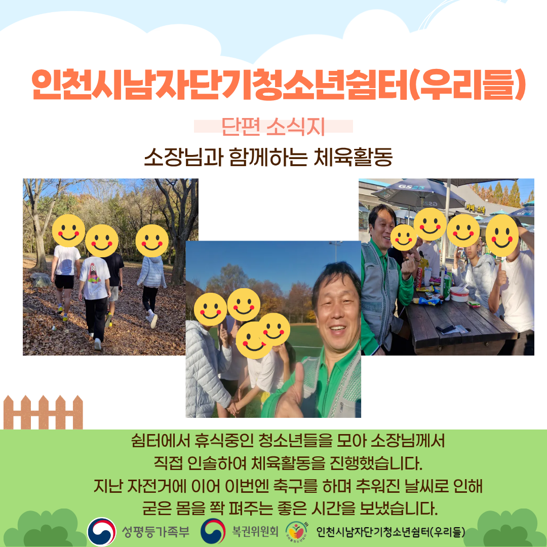 2025년 하반기 단편소식지 2탄! 최고관리자 0 82 2025.12.15 12:07 소장님과 청소년의 체육활동!! 땀 뻘뻘 흘리며 신나게 운동하고 굳은 몸을 쫙 펴주는 좋은 시간을 보냈습니다!^^