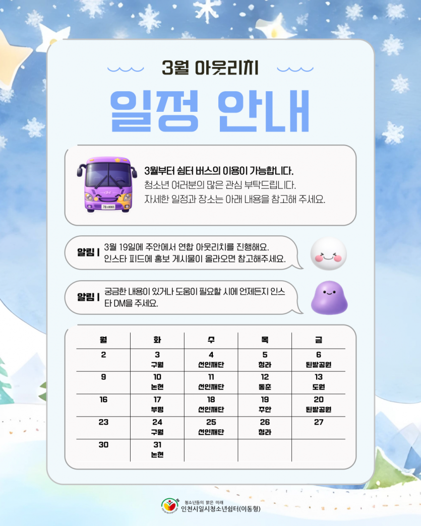 2026년 3월 아웃치리 활동 일정 공지 최고관리자 공지사항 0 46 03.03 17:12 안녕하세요. 인천시일시청소년쉼터(이동형) 입니다.2026년 3월 아웃리치 일정 공지합니다.쉼터 버스 이용이 가능합니다.문의 사항 있으시면 언제든 연락주세요.감사합니다.전화 : 032-513-1388 / 010-9931-1388 SNS : 인스타그램(@iybus2023), 카카오톡플러스(인천시일시청소년쉼터-이동형) 채널 검색