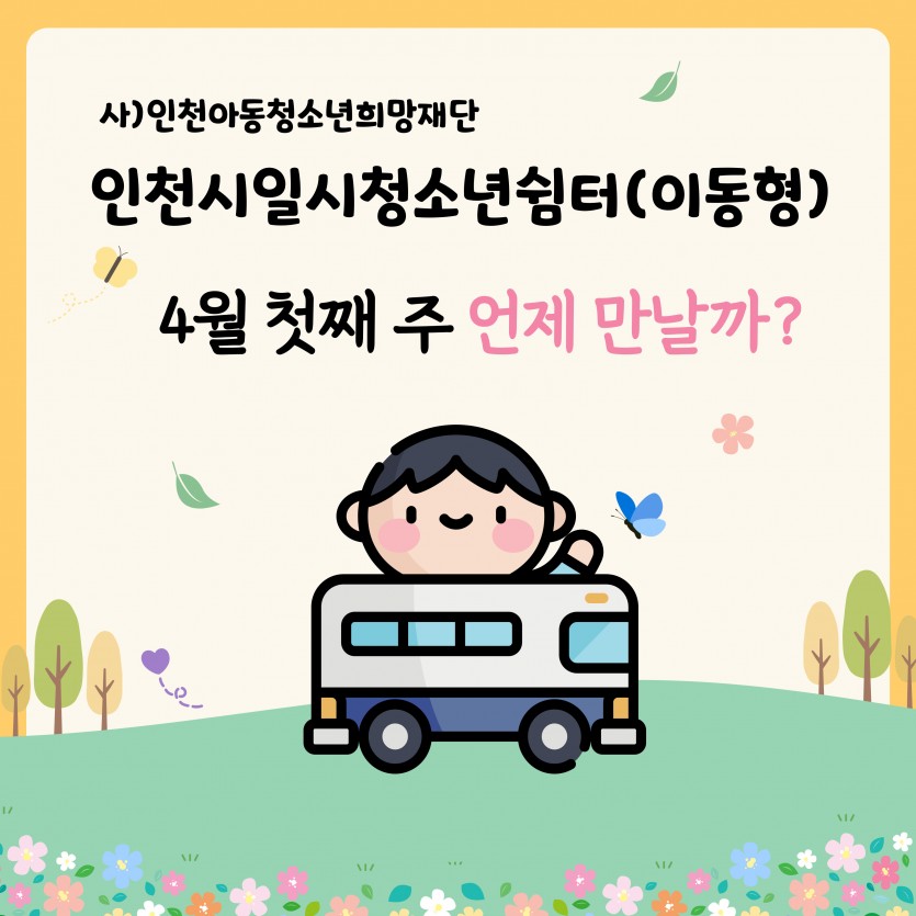 4월 첫째 주 아웃리치 일정 공지 최고관리자 공지 0 382 2025.03.27 13:09 인천시일시청소년쉼터(이동형) 입니다.4월 첫째 주 아웃리치 일정 공지합니다.문의전화 : 032-513-1388 / 010-9931-1388 SNS : 인스타그램(iybus2023), 카카오톡플러스 (인천시일시청소년쉼터-이동형) 채널 검색