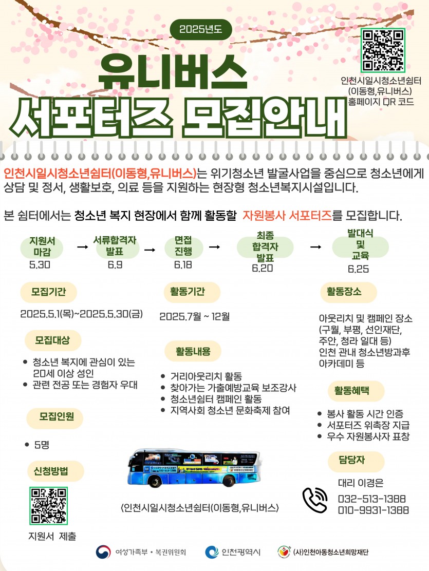 자원봉사 서포터즈 모집 최고관리자 공지사항 0 691 2025.04.30 10:42 인천시일시청소년쉼터(이동형)에서는 청소년 복지현장에서 함께 활동할 자원봉사 서포터즈를 모집합니다.청소년 복지에 관심이 있는 20세 이상 성인, 관련 전공자 또는 경험자 중 관심 있으신 분께서는 많은 관심과 참여 부탁드립니다!^^
