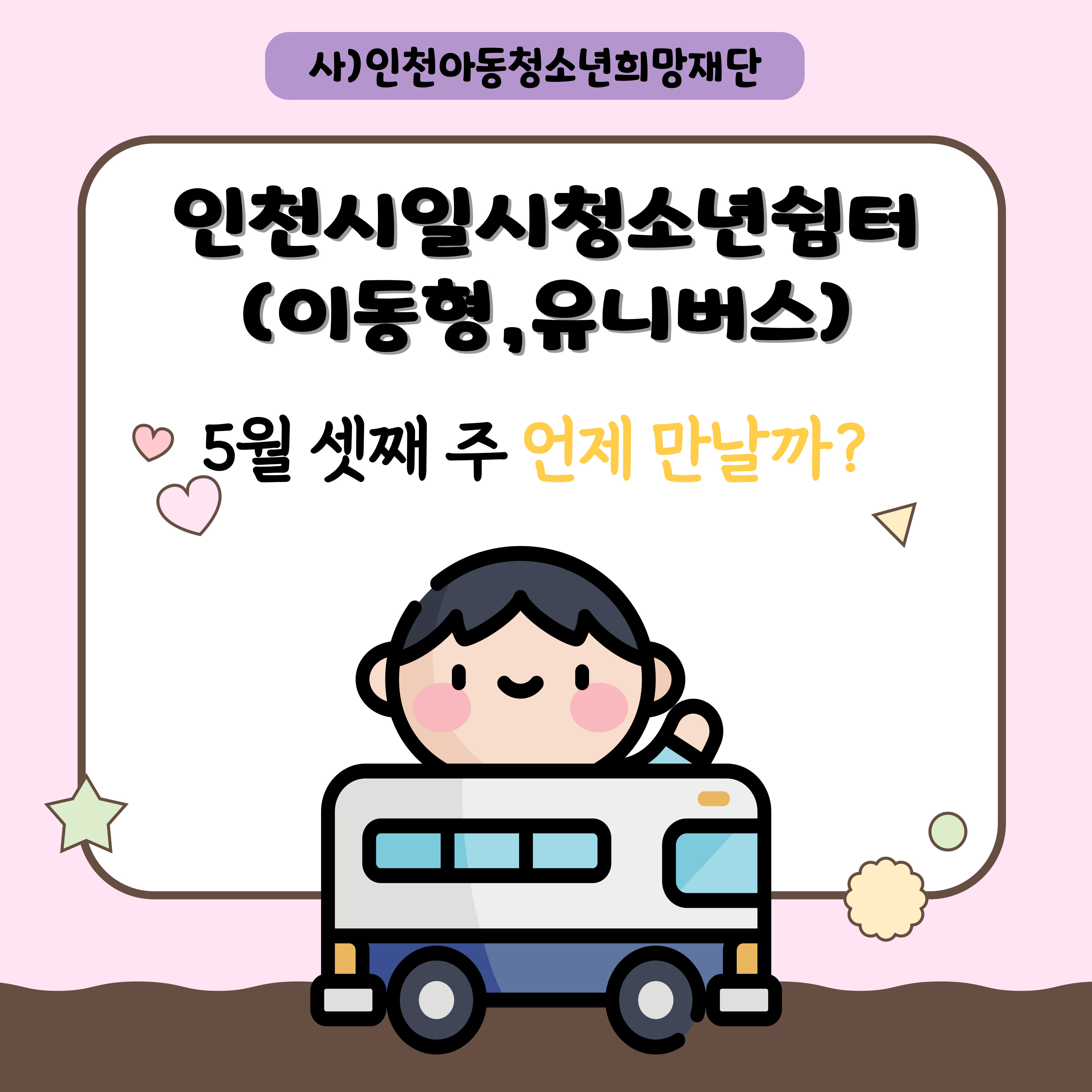 5월 셋째 주 아웃리치 일정 최고관리자 공지사항 0 422 2025.05.22 09:11 인천시일시청소년쉼터(이동형) 입니다.5월 셋쨰 주 아웃리치 일정 공지합니다.문의전화 : 032-513-1388 / 010-9931-1388 SNS : 인스타그램(iybus2023), 카카오톡플러스 (인천시일시청소년쉼터-이동형) 채널 검색