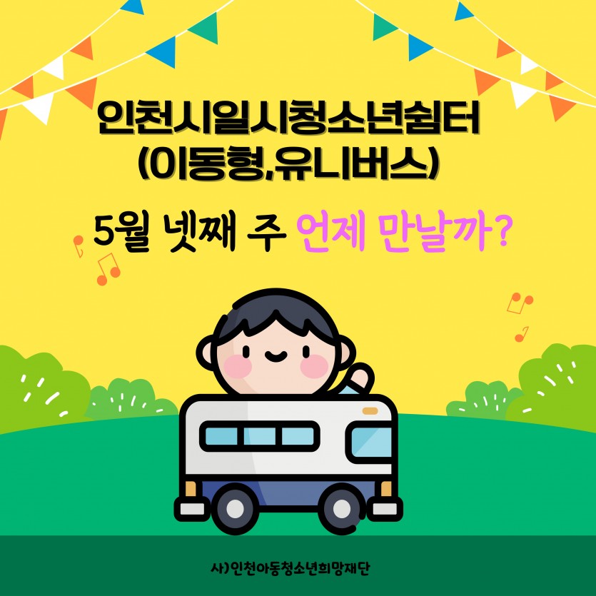 5월 넷째 주 아웃리치 일정 최고관리자 공지사항 0 419 2025.05.22 09:11 인천시일시청소년쉼터(이동형) 입니다.5월 넷쨰 주 아웃리치 일정 공지합니다.문의전화 : 032-513-1388 / 010-9931-1388 SNS : 인스타그램(iybus2023), 카카오톡플러스 (인천시일시청소년쉼터-이동형) 채널 검색