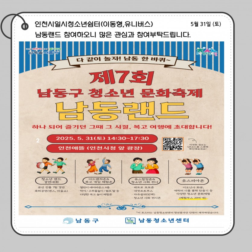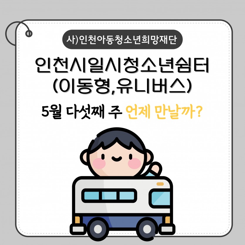 5월 다섯째 주 아웃리치 일정 최고관리자 공지사항 0 438 2025.05.22 14:14 인천시일시청소년쉼터(이동형) 입니다.5월 다섯째 주 아웃리치 일정 공지합니다.문의전화 : 032-513-1388 / 010-9931-1388 SNS : 인스타그램(iybus2023), 카카오톡플러스 (인천시일시청소년쉼터-이동형) 채널 검색