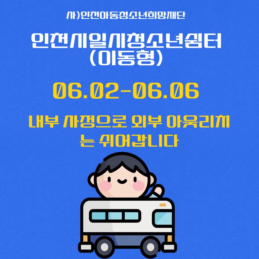 6월 첫째 주 아웃리치 일정 최고관리자 공지 0 291 2025.06.09 13:34 인천시일시청소년쉼터(이동형) 입니다.6월 첫째 주 아웃리치 일정 공지합니다.문의전화 : 032-513-1388 / 010-9931-1388 SNS : 인스타그램(iybus2023), 카카오톡플러스 (인천시일시청소년쉼터-이동형) 채널 검색
