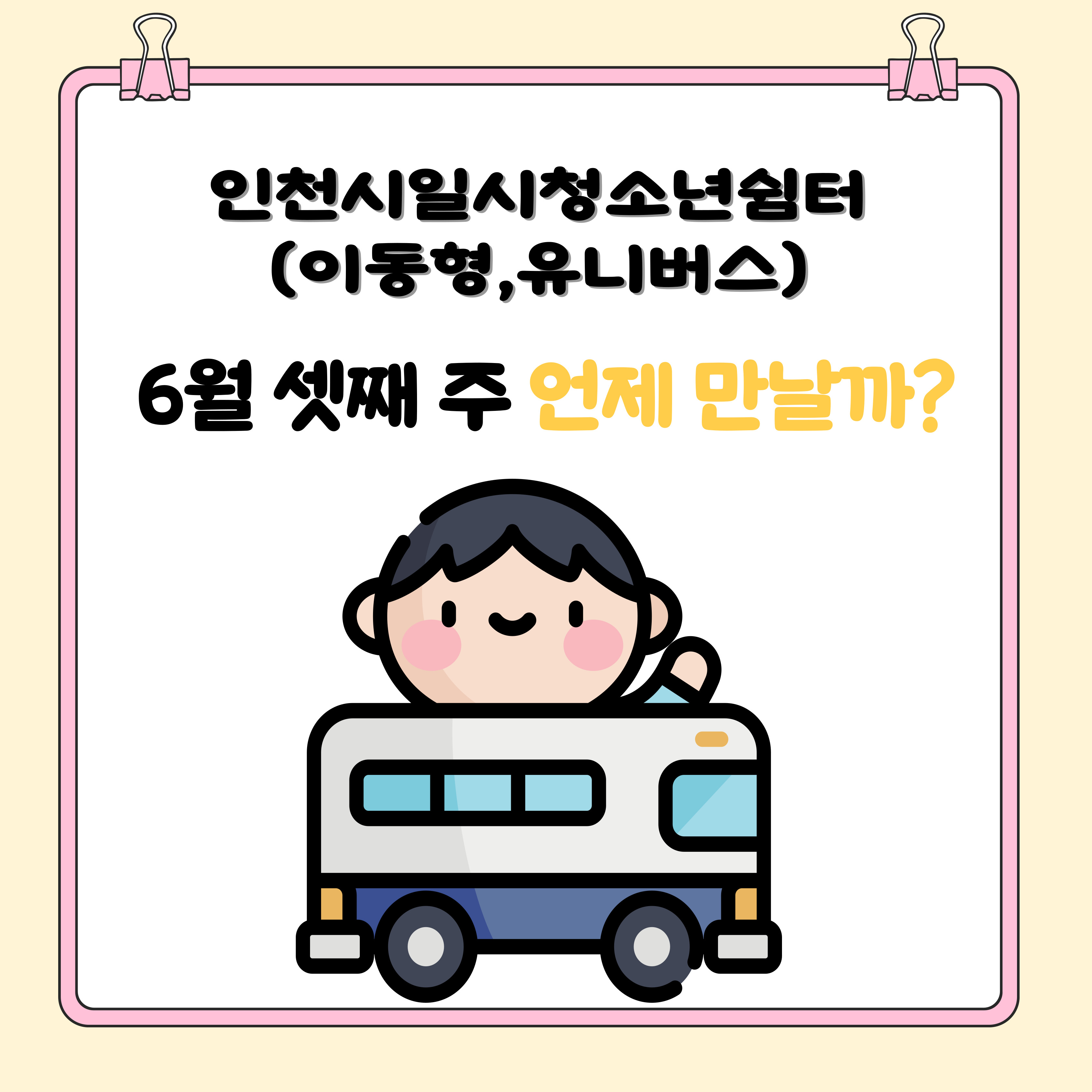 6월 셋째 주 아웃리치 일정 최고관리자 공지 0 634 2025.06.12 13:48 인천시일시청소년쉼터(이동형) 입니다.6월 셋째 주 아웃리치 일정 공지합니다.문의전화 : 032-513-1388 / 010-9931-1388 SNS : 인스타그램(iybus2023), 카카오톡플러스 (인천시일시청소년쉼터-이동형) 채널 검색