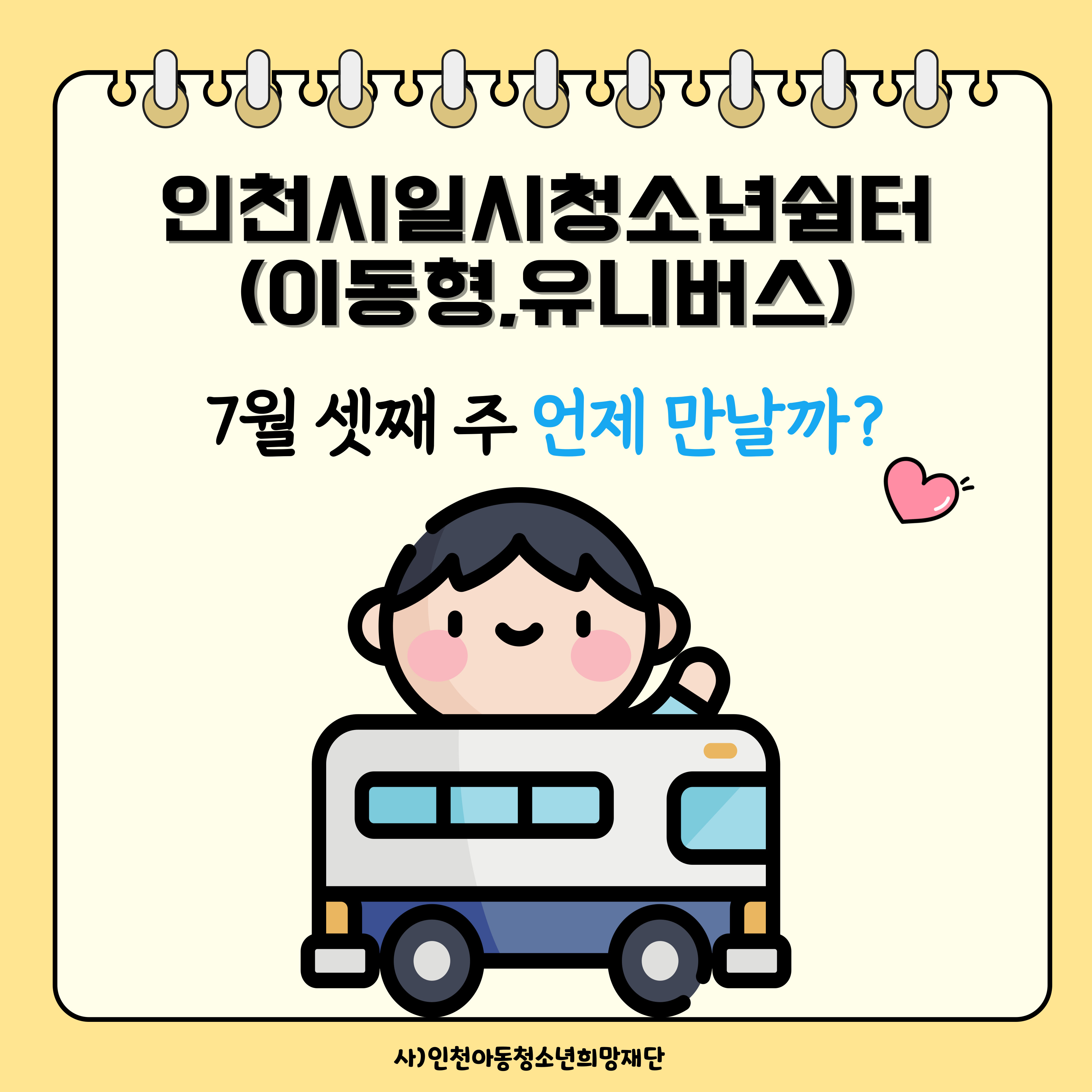 7월 셋째 주 아웃리치 일정 최고관리자 공지 0 292 2025.07.11 09:16 인천시일시청소년쉼터(이동형) 입니다.7월 셋째 주 아웃리치 일정 공지합니다.문의전화 : 032-513-1388 / 010-9931-1388 SNS : 인스타그램(iybus2023), 카카오톡플러스 (인천시일시청소년쉼터-이동형) 채널 검색