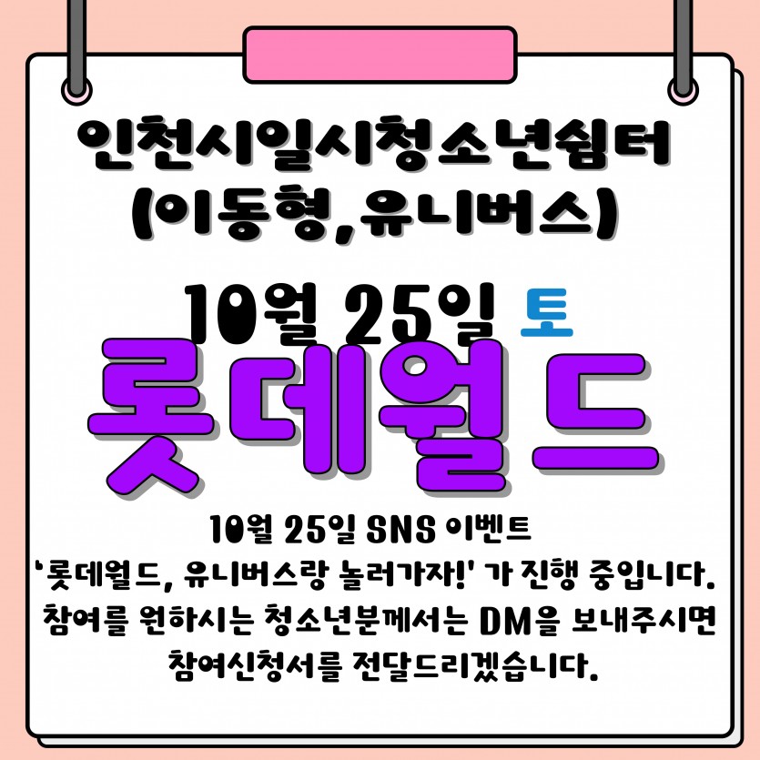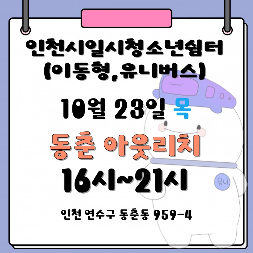 10월 넷째 주 아웃리치 일정 공지 최고관리자 공지사항 0 274 2025.10.16 15:22 인천시일시청소년쉼터(이동형) 입니다.10월 넷째 주 아웃리치 일정 공지합니다.문의전화 : 032-513-1388 / 010-9931-1388 SNS : 인스타그램(iybus2023), 카카오톡플러스 (인천시일시청소년쉼터-이동형) 채널 검색