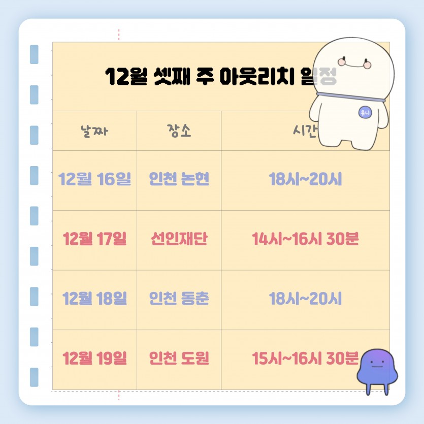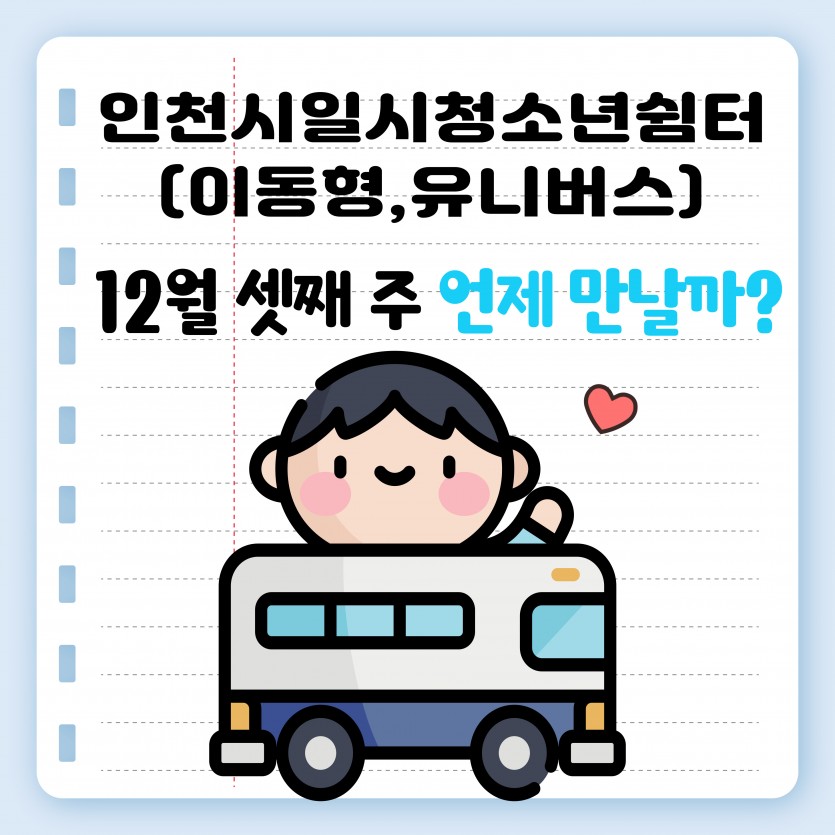 12월 셋쨰 주 아웃리치 일정 공지 최고관리자 공지 0 82 2025.12.16 09:04 인천시일시청소년쉼터(이동형) 입니다.12월 셋째 주 아웃리치 일정 공지합니다.문의전화 : 032-513-1388 / 010-9931-1388 SNS : 인스타그램(iybus2023), 카카오톡플러스 (인천시일시청소년쉼터-이동형) 채널 검색