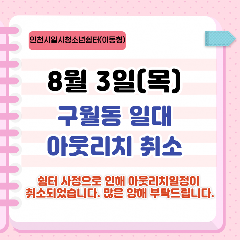 8월 3일(목) 아웃리치 일정 취소 공지 최고관리자 공지 0 827 2023.08.02 09:38 쉼터 내부 사정으로 인해 8월 3일(목) 아웃리치 일정이 취소되었습니다.많은 양해 부탁드립니다.