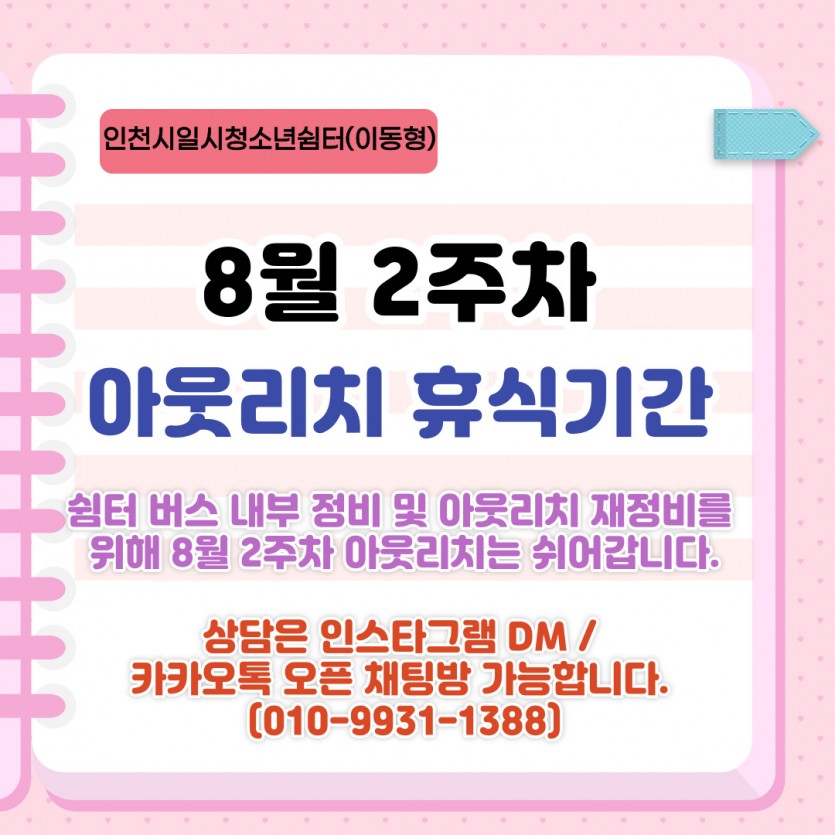 8월 2주차 아웃리치 휴식 기간 최고관리자 공지사항 0 1246 2023.08.07 16:18 쉼터 버스 내부 정비 및 아웃리치 재정비를 위해 8월 2주차 아웃리치는 쉬어갑니다.상담은 인스타그램 DM / 카카오톡 오픈 채팅방(오픈채팅방에 인천시일시청소년쉼터(이동형) 검색) 가능합니다. ^^많은 양해 부탁드립니다.
