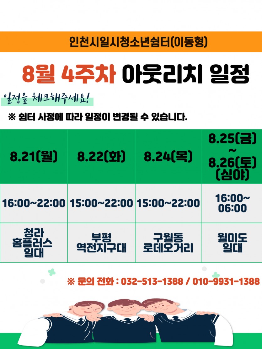 8월 4주차 아웃리치 일정 최고관리자 공지 0 781 2023.08.17 13:25 저희 인천시일시청소년쉼터(이동형) 8월 4주차 아웃리치 일정입니다 !!^_^*많은 관심과 참여 부탁드립니다!!^^❤️9세 ~ 24세 청소년이라면 누구나 무료로 이용가능해요❤️⠀고민이 있거나 상담을 받고 싶은 친구들이 있다면 언제든지 인천시일시청소년쉼터(이동형)로 오세요❗저희는 언제나 청소년 여러분들을 기다리고 있답니다.