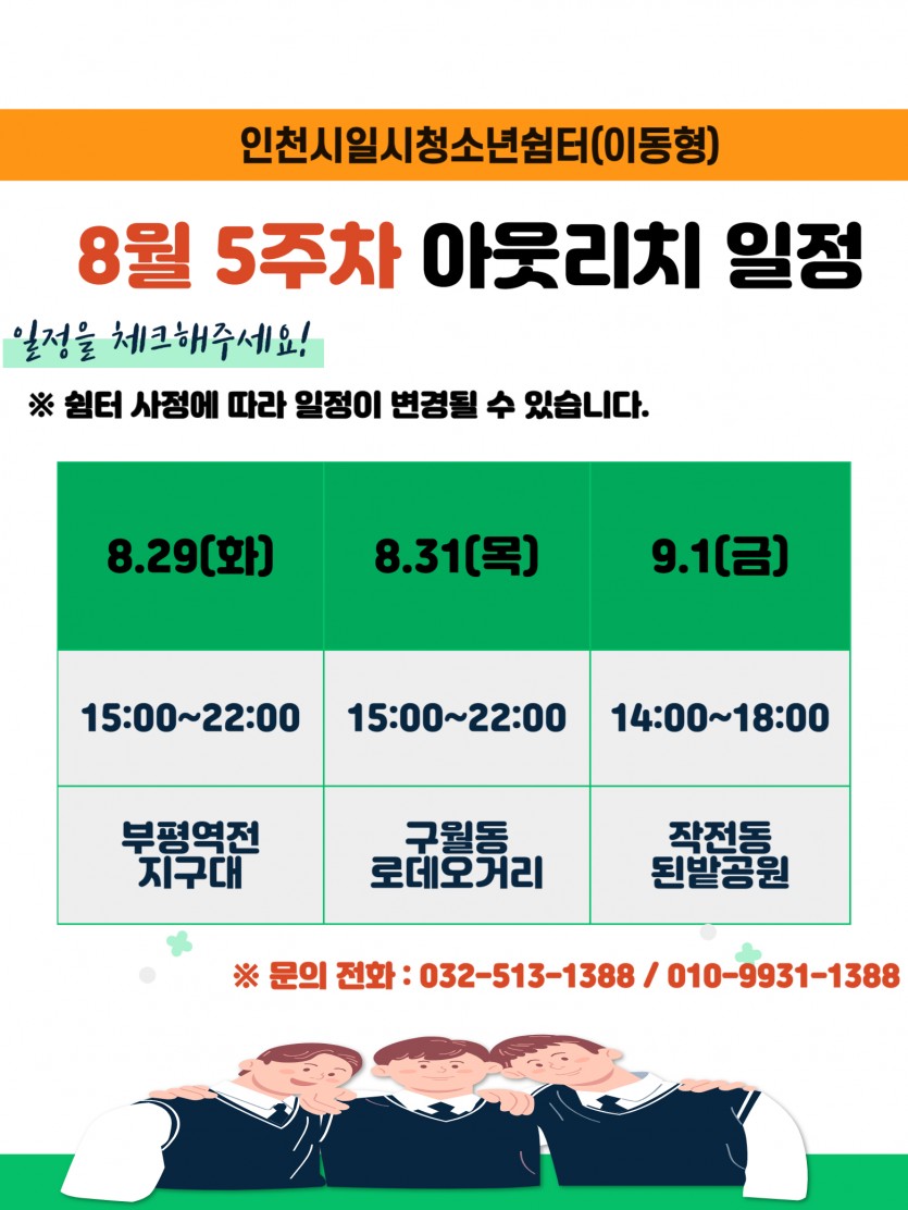 8월 5주차 아웃리치 일정 최고관리자 공지 0 812 2023.08.24 13:58 저희 인천시일시청소년쉼터(이동형) 8월 5주차 아웃리치 일정입니다 !!^_^*많은 관심과 참여 부탁드립니다!!^^❤️9세 ~ 24세 청소년이라면 누구나 무료로 이용가능해요❤️⠀고민이 있거나 상담을 받고 싶은 친구들이 있다면 언제든지 인천시일시청소년쉼터(이동형)로 오세요❗저희는 언제나 청소년 여러분들을 기다리고 있답니다.