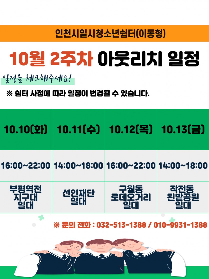 10월 2주차 아웃리치 일정 공지 최고관리자 공지 2 2234 2023.10.10 10:49 저희 인천시일시청소년쉼터(이동형) 10월 2주차 아웃리치 일정입니다 !!^_^*많은 관심과 참여 부탁드립니다!!^^❤️9세 ~ 24세 청소년이라면 누구나 무료로 이용가능해요❤️⠀고민이 있거나 상담을 받고 싶은 친구들이 있다면 언제든지 인천시일시청소년쉼터(이동형)로 오세요❗저희는 언제나 청소년 여러분들을 기다리고 있답니다!