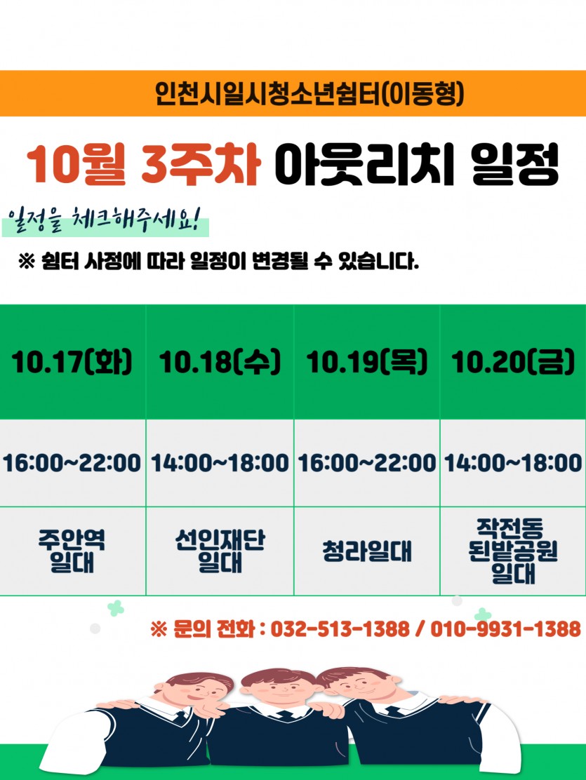 10월 3주차 아웃리치 일정 최고관리자 공지사항 0 1081 2023.10.17 09:19 저희 인천시일시청소년쉼터(이동형) 10월 3주차 아웃리치 일정입니다 !!^_^*많은 관심과 참여 부탁드립니다!!^^❤️9세 ~ 24세 청소년이라면 누구나 무료로 이용가능해요❤️⠀고민이 있거나 상담을 받고 싶은 친구들이 있다면 언제든지 인천시일시청소년쉼터(이동형)로 오세요❗저희는 언제나 청소년 여러분들을 기다리고 있답니다!