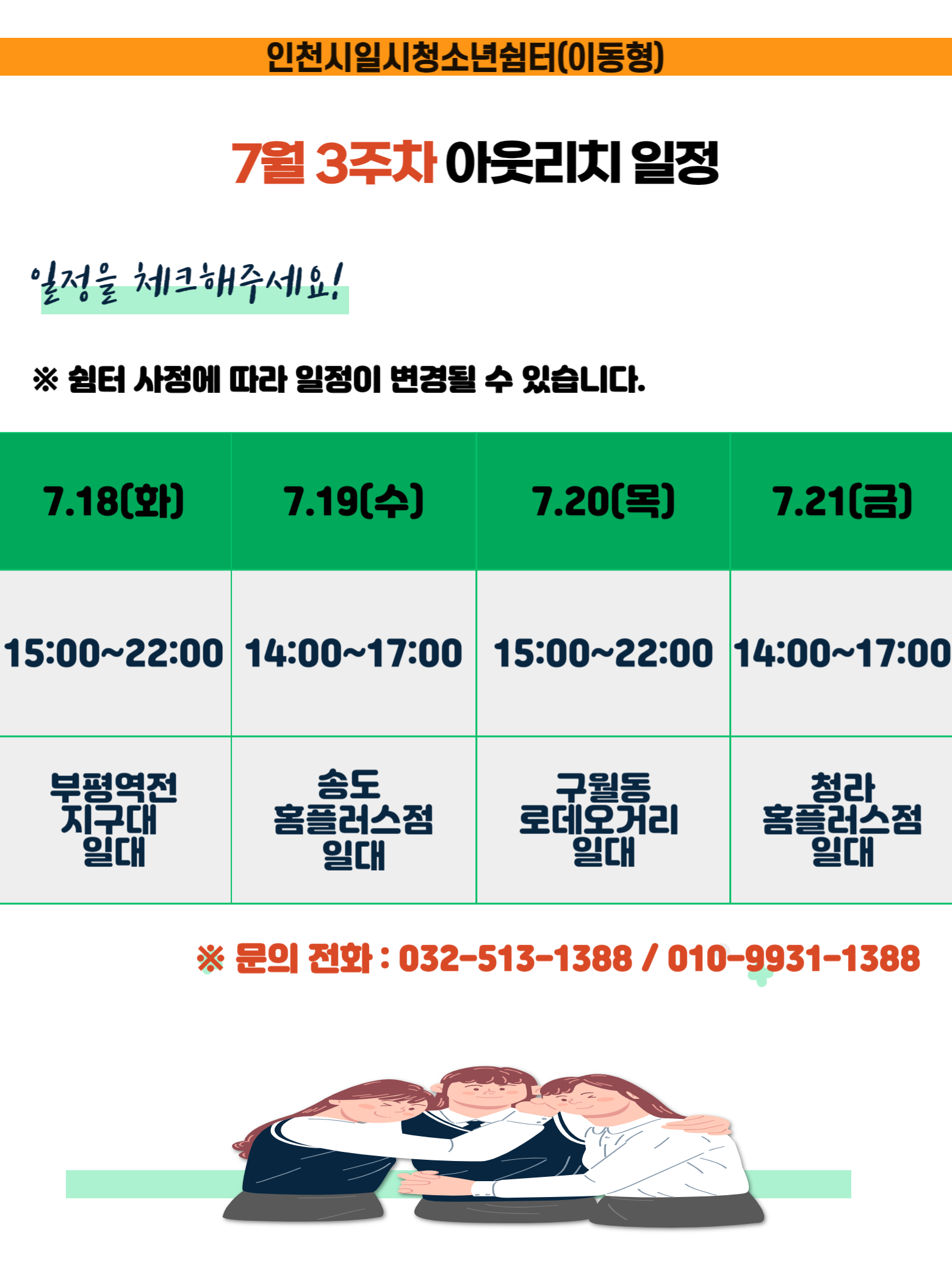 7월 3주차 아웃리치 일정 최고관리자 공지사항 0 1284 2023.07.17 10:14 저희 인천시일시청소년쉼터(이동형) 7월 3주차 아웃리치 일정입니다 !!^_^*우천으로 인해 일정 변경이 있을 수 있습니다. 일정 변경시 일정변경 건에 대해 재공지드리겠습니다!!많은 관심과 참여 부탁드립니다!!^^❤️9세 ~ 24세 청소년이라면 누구나 무료로 이용가능해요❤️⠀고민이 있거나 상담을 받고 싶은 친구들이 있다면 언제든지 인천시일시청소년쉼터(이동형)로 오세요❗저희는 언제나 청소년 여러분들을 기다리고 있답니다.