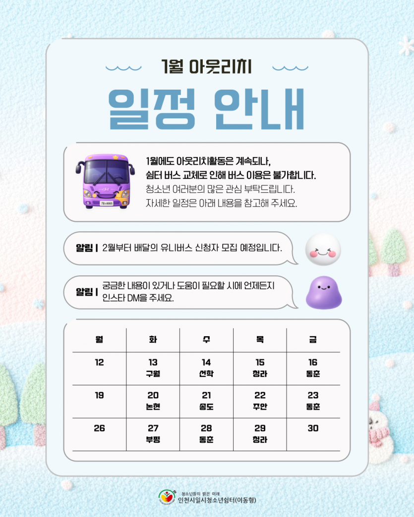 2026년 1월 아웃리치 일정 공지 최고관리자 공지사항 0 75 01.13 09:30 안녕하세요. 인천시일시청소년쉼터(이동형) 입니다.2026년 1월 아웃리치 일정 공지합니다.쉼터 버스 교체로 인하여 쉼터 버스 이용은 불가합니다.문의 사항 있으시면 언제든 연락주세요.감사합니다.전화 : 032-513-1388 / 010-9931-1388 SNS : 인스타그램(@iybus2023), 카카오톡플러스(인천시일시청소년쉼터-이동형) 채널 검색