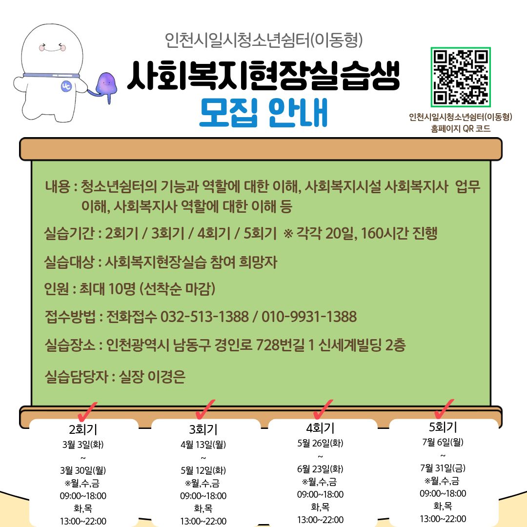 사회복지현장실습생 모집 최고관리자 공지 0 56 01.22 11:21 저희 쉼터에서는 2회기, 3회기, 4회기, 5회기 (총 4회기) 사회복지현장실습을 진행할 예정입니다.많은 관심과 참여부탁드리며, 신청 및 문의는 032-513-1388 / 010-9931-1388로 연락주시기 바랍니다.