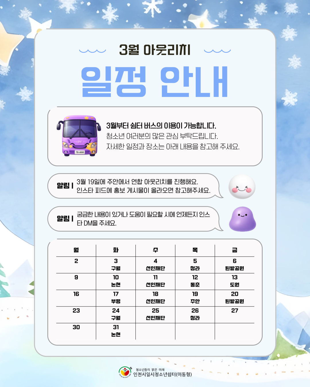 2026년 3월 아웃치리 활동 일정 공지 최고관리자 공지사항 0 44 03.03 17:12 안녕하세요. 인천시일시청소년쉼터(이동형) 입니다.2026년 3월 아웃리치 일정 공지합니다.쉼터 버스 이용이 가능합니다.문의 사항 있으시면 언제든 연락주세요.감사합니다.전화 : 032-513-1388 / 010-9931-1388 SNS : 인스타그램(@iybus2023), 카카오톡플러스(인천시일시청소년쉼터-이동형) 채널 검색
