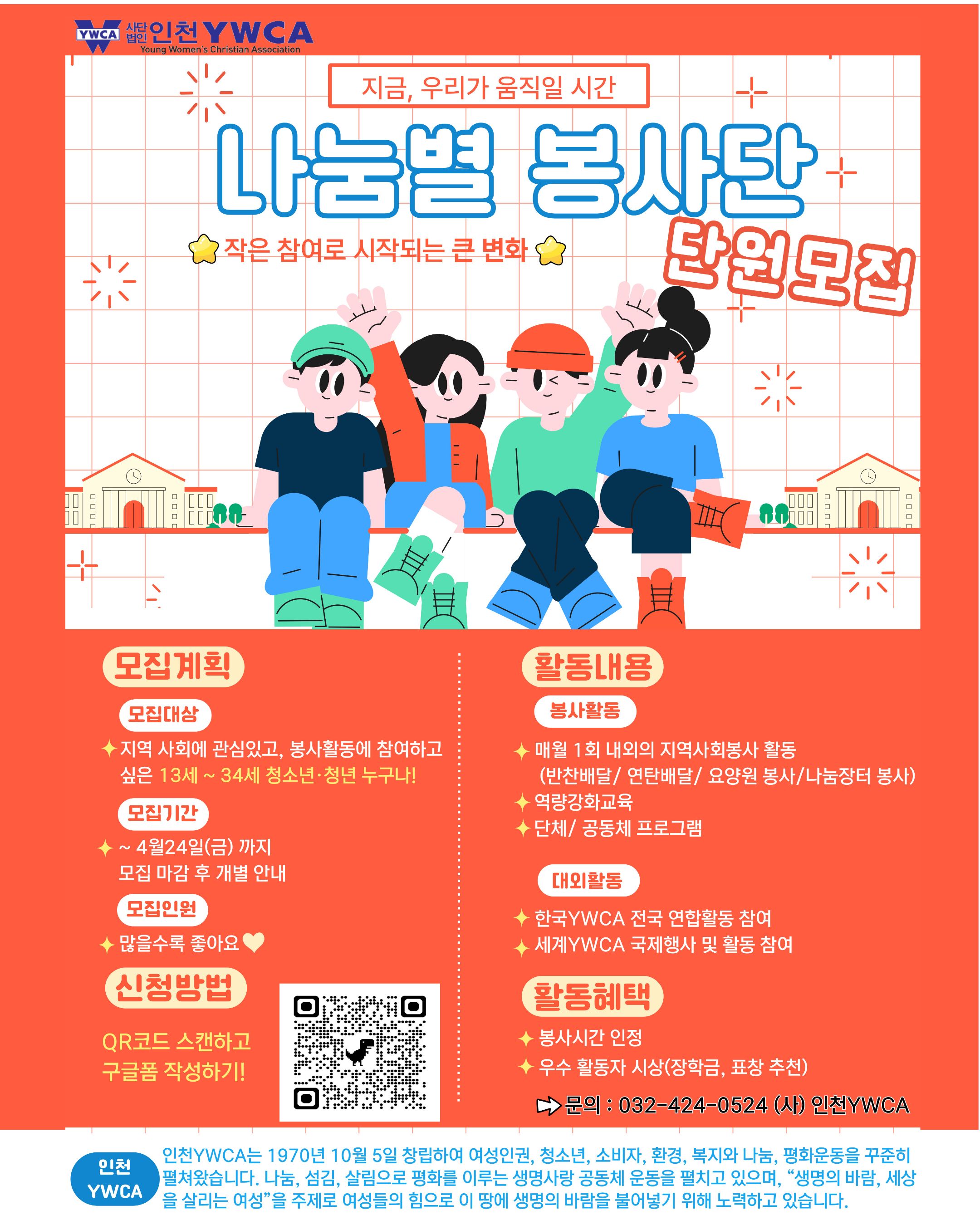 YWCA 나눔별 봉사단 단원 모집 안내 최고관리자 공지사항 0 22 03.18 09:32 (사)인천YWCA에서 나눔별 봉사단 단원을 모집합니다.청소년과 청년 여러분의 많은 관심과 참여를 부탁드립니다.